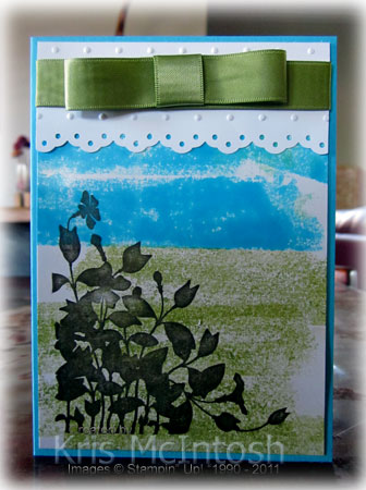 Anyway, I used Old Olive ink for the bottom of my card and then Tempting Turquoise for the top.  Once I had the coverage of ink I wanted, I stamped the image from the My Friend stamp set in Early Expresso.   I punched the long edge of a strip of Whisper White card using the Eyelet Edge punch (I can’t believe this is retiring) and also ran it through the Big Shot using the Perfect Polka Dots Embossing Folder, although I only embossed the top section of the card (not where I had punched).  I attached the embossed and punched card to the top of the image panel and wrapped it with Old Olive 5/8″ Satin RibbonThe image panel is attached to scored and folded Tempting Turquoise card.  I made the bow by looping a length of Old Olive 5/8″ Satin Ribbon onto itself and then wrapping the join with another piece of the ribbon.  It is attached to the card front using Mini Glue Dots.