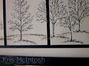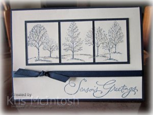 I stamped the image from Lovely as a Tree (NOT retiring, yay) onto Whisper White card using Night of Navy ink and then cut the image into three panels. I attached the image panels to Night of Navy card and then to the card front. I used my Two-Way Glue pen on the trees and then added some Dazzling Diamonds. I absolutely adore the simplicity of this card, although without the bling it would probably be a little too clean and simple.