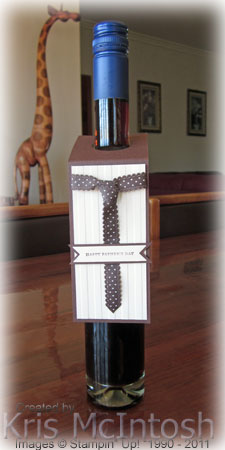 The idea came from a card I found on Mary Fish’s blog a long time ago which used ribbon to create a tie.  I used Chocolate Chip card to make the hanger.  I punched a hole using the 1-3/8″ circle punch, but of course you would need to make sure that it goes over the neck of your bottle.  I scored the Chocolate Chip card, so that it would hang a little straighter on the bottle.  I ran a piece of Very Vanilla card through the Big Shot using the Stripes Embossing Folder and tied Chocolate Chip 1/2″ Scallop Dots  Ribbon to simulate a tie before attaching it to the Chocolate Chip card.  I stamped Happy Fathers Day from the Teeny Tiny Sentiments stamp set onto Very Vanilla card using Chocolate Chip ink.  I used my Framelit bitty Banners to cut the greeting and then attached it to Chocolate Chip card and free hand cut the “v” shape to match.  I attached it over the ribbon to simulate a Tie Clip.  A very simple little tag but it does dress the bottle up somewhat.