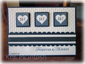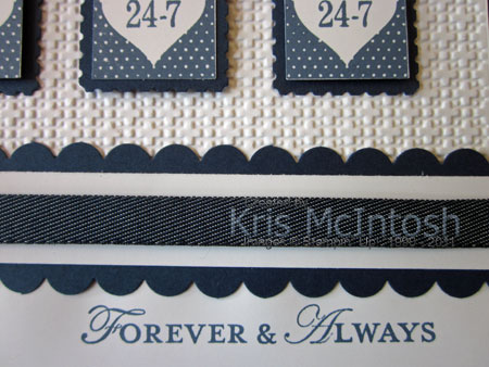 I embossed the top 2/3rds of a piece of Whisper White card using the Square Lattice Embossing Folder.  I stamped the greeting from the Loving Thoughts stampset onto the bottom right hand corner using Night of Navy ink.  I punched both long edges of a strip of Night of Navy card using the Scallop Border Punch and attached it to cover the end of the embossing on the Whisper White card.  I added a strip of Whisper White to the punched Night of Navy card, wrapped it with the 3/8″ Denim Jean Ribbon and then attached it to scored and folded Night of Navy card.  I stamped the “24-7” imaged from the Pretty Postage stamp set three times onto Whisper White card using Night of Navy ink.  I punched the images using the 1″ Square Punch.  I punched Night of Navy card using the Postage Stamp Punch three times.  I attached two of the stamped 1″ square images to the Night of Navy postage stamps using dimensionals.  I attached the other stamped image using Snail and then used dimensionals to attach it to the card front – this is the central image.  The other two are attached to the card front using snail.