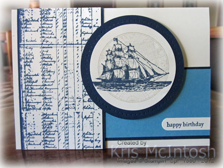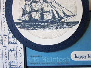 I cut a piece of Marina Mist card 10.5cm x 4.5cm and attached 1cm strips of Night of Navy card behind both long edges.  I stamped “happy birthday” from the Teeny Tiny Sentiments stamp set onto Whisper White card using Night of Navy ink.  I punched the greeting using the Word Window punch and attached it to the Marina Mist card so that the right hand edge of the greeting was cut off square with the edge of the Marina Mist card.  This piece was then attached to scored and folded Whisper White card.  I stamped the “log” image from The Open Sea stampset onto Whisper White card using Night of Navy ink.  This piece also has 1cm strips of Night of Navy card attached behind before attaching it to the left hand side of the card front.  I stamped the “world” image from The Open Sea stamp set onto Whisper White card and punched it using the 2-1/2″ Circle Punch.  The sailing ship image from the same stampset was stamped over the top using Night of Navy ink.  I cut Night of Navy card using the 3″ Circle Originals Die and pierced a row of holes around the edge using the Essentials Paper Piercing Pack, Stampin’ Pierce Mat and Paper Piercing Tool.  I attached the boat image to the Night of Navy 3″ Circle and then to the card front using dimensionals.