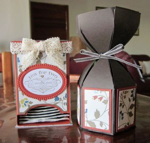 I also decided to make her a tea bag dispenser, as I know Jenny likes her tea.  I used a tutorial that I found through Pinterest (I know I shouldn’t go there so much but look at the wonderful things you find) by Kerry Bunting.  I did change the opening for the tea bags slightly.    I made mine using Cajun Craze and Early Expresso card and Comfort Cafe Designer Series Paper.  I used the Tea Shoppe stamp set to create the “tea for two” to go on the front.   The beautiful Victoria Crochet Trim is the perfect finishing touch.