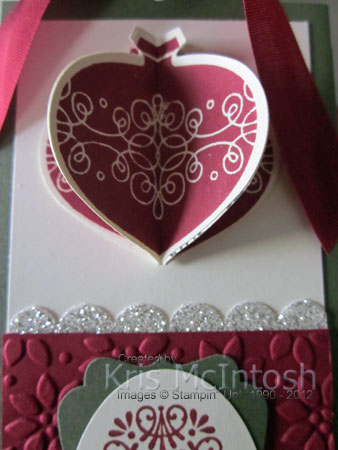I cut the top of a piece of Always Artichoke card using the Window Framelits in the Holiday Catalogue and added a layer of Very Vanilla. I punched a narrow strip of Silver Glimmer Paper using the Scallop Edge Border Punch and attached it behind a piece of Cherry Cobbler card embossed using the Petals-A-Plenty Embossing Folder, before attaching it to the Very Vanilla card. I stamped the “25” image from the Merry and Type stamp set onto Very Vanilla card, punched it using the Extra Large Oval Punch and attached it to an Always Artichoke Decorative Label. This piece is attached over the embossed Cherry Cobbler card. I stamped the “christmas bauble” from the Tags Til Christmas stamp set three times onto Very Vanilla card using Cherry Cobbler ink.