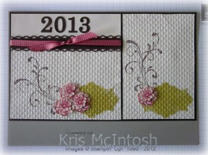 The numbers for 2013 were cut using the Timeless Type Junior Alphabet (retired) from Chocolate Chip card.  The flower was stamped six times onto Very Vanilla card using Primrose Petals ink and cut out, three full flowers and three partial flowers.  The smaller flowers were attached to the full flowers using dimensionals and then over the swirls using Mini Glue Dots.  We attached medium Basic Pearls to the centres of the flowers.