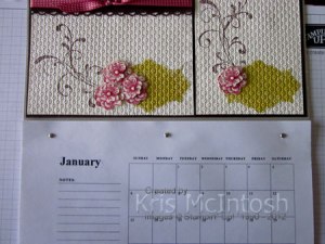 This is another project that we made at the all day class at Beachmere.  If you remember last year my friend Vicky shared a calendar she made with me and gave me a template for the calendar months.  This year we used a template that was part of a tutorial I purchased from Create with Connie and Mary New Catalogue 2012 Edition by the very talented designer Melissa Davies.