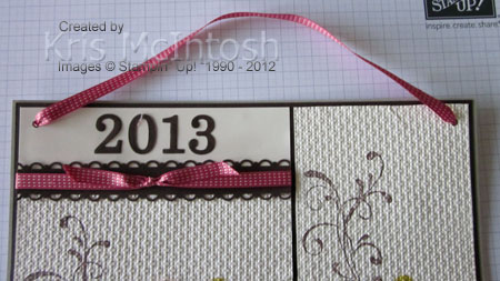 We attached the calendar pages by piercing three holes through the calendar and the Sahara Sand card and inserted Mini Silver Brads.  We punched holes in the top corners and threaded through a long piece of Primrose Petals 1/2″ Stitched Satin Ribbon, tying knots at the back to create a hanger.
