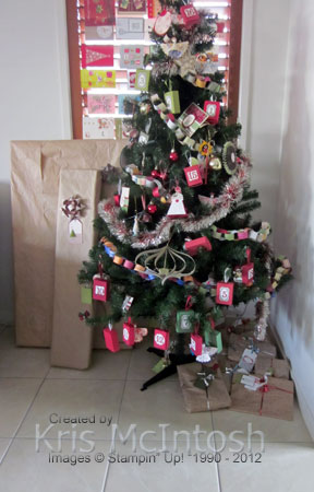 Before I go I thought I would share a picture of my tree, with the parcels wrapped and ready to be opened tomorrow.  All the parcels are wrapped in the brown paper that Stampin’ Up! so thoughtfully supplies with each of my orders.   Sometimes I stamp or wheel a design over the paper and sometimes I leave it plain.  I always add a tag which I have made and sometimes a designer paper bow.