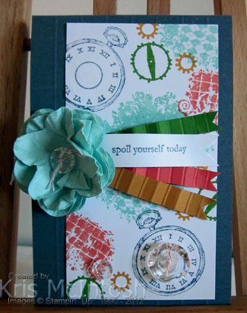 Who would have thought that you could make a notebook look so pretty. This cover is another of the make and takes from the Brisbane Regionals this year. It uses the Clockworks stamp set we were given as part of our registration and a gorgeous colour combination – Basic Gray, Calypso Coral, Pool Party, Gumball Green and More Mustard.
