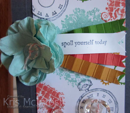 I didn’t have the same sentiment so I used one from the Bring on the Cake stamp set. Doesn’t all that scoring look fantastic! I think the little banners are so cute too. Adding the addition of the Vintage Faceted Buttons just adds the right amount of bling. I’m thinking this set will be great for backgrounds for all kinds of things.