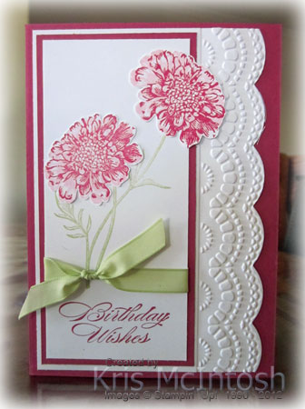 Mum’s card is also inspired by a card on Pinterest. You can see the inspiration card here . You can see the original card here at Splitcoast Stampers . I started by cutting one long edge of Whisper White card using the Large Scallop Edgelit and then embossing the same card using the Delicate Designs Embossing Folder which matched the Edgelit. I attached this piece to scored and folded Rose Red card. I stamped the greeting from the Bring on the Cake stamp set onto the lower edge of Whisper White card using Rose Red ink. I stamped the leaf image from the Field Flowers stamp set above the greeting using Certainly Celery ink. I wrapped the image panel with Certainly Celery 3/8″ Tafetta Ribbon and tied a knot before attaching it to Rose Red card and then the card front.