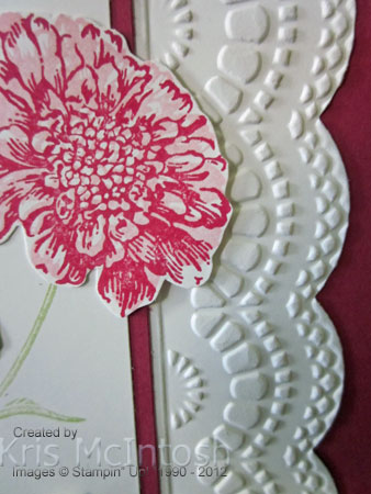 I stamped the solid flower image onto scrap Whisper White card twice using Pretty in Pink ink and then stamped the outline image over the top using Rose Red ink. I cut the flower out and attached them to the card front. Again I am really happy with the finished card.
