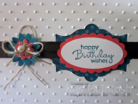 I used one of the framelits from the Apothecary Accents Framelits to cut a window in Whisper White card and then embossed it using the Perfect Polka Dots Embossing Folder. I attached a piece of Island Indigo Polka Dot Designer Series paper from the 2011-2012 In-Colour Designer Series Paper Stack behind the frame using Mini Glue Dots. I attached a narrow piece of Early Expresso card which has a “flag” cut in one end over the frame. This whole piece is then attached to scored and folded Whisper White card using dimensionals. I used the Boho Blossom Punch to cut one large flower from Island Indigo card and one small flower from Calypso Coral card.