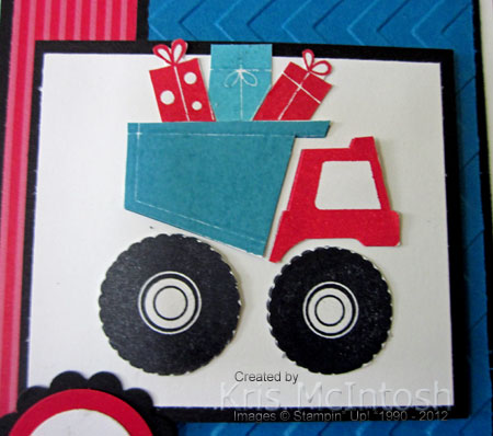 IMG_0010I added Whisper White card to scored and folded Basic Black card.  I attached Real Red Striped Designer Series Paper from the Brights Designer Series Paper Stack to Basic Black card and attached it to the left hand side of the card front.  I embossed Pacific Point card using the Chevron Embossing Folder, attached it to Basic Black card and attached it to the right hand side of the card front.  I inked the truck stamp from the I Dig You stamp set using Real Red, Pacific Point and Basic Black Stampin’ Write Markers and stamped onto Whisper White card.  I stamped the truck onto scrap Whisper White card using Real Red ink and cut out the cabin.  I stamped the truck onto scrap Whisper White card using Pacific Point ink and cut out the trailer.  I stamped the truck again onto scrap Whisper White card using Basic Black ink and cut out the tyres.  The cut out pieces were adhered over the stamped images, just to give the truck more dimension.  I attached the image panel to Basic Black card.  The parcel images were stamped using Real Red ink and again using Pacific Point ink onto scrap Whisper White card and cut out.  IMG_0012The parcel images were attached to the image panel over the back of the trailer.  The truck panel is attached to the card front using dimensionals.  I stamped “wish big” from the Pennant Parade stamp set onto Whisper White card using Pacific Point ink and punched it using the 3/4″ Circle Punch.  The greeting is attached to a Real Red 1″ Circle and then to a Basic Black 1-1/4″ Scallop Circle.  The greeting is attached to the card front using dimensionals.