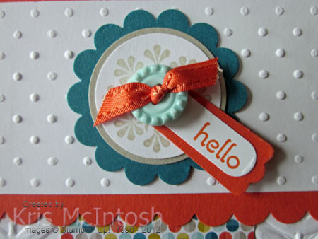I used the beautiful Vine Street Embossing Folder (Free) to emboss Whisper White card and attached it to scored and folded Sahara Sand. I cut a wide strip of the Sycamore Street Designer Series Paper. cut a fish tail in one end and attached it to the card front. Next I embossed another piece of Whisper White card using the Perfect Polka Dots Embossing Folder, attached it to Calypso Coral card with one long edge punched with the Scallop Border Punch and then to the card front. I stamped the image from the Madison Avenue stamp set onto Whisper White card using Sahara Sand ink and punched it using the 1-1/4″ Circle Punch. I also punched a 1-3/8″ Circle from Sahara Sand card and a 1-3/4″ Scallop Circle from Island Indigo card. I layered the circles one on top of the other and then attached them to the card front. I stamped “hello” from the Perfect Banner stamp set onto Whisper White card using Calypso Coral ink and punched it using the Word Window Punch.