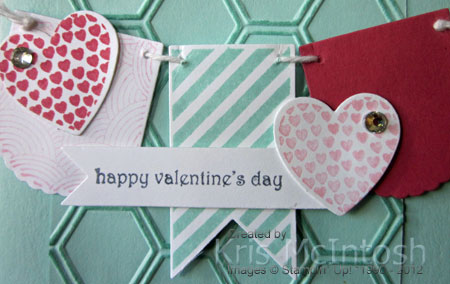 I embossed a piece of Pool Party card using the Honeycomb Embossing Folder, rubbed the Pool Party ink pad lightly over the top to enhance the embossing and then attached it to scored and folded Pool Party card. I stamped the images from the Hearts A Flutter stamp set using Pretty in Pink, Pool Party and Primrose Petals ink. Once the images were stamped, you just use the matching Hearts a Flutter Framelits to cut them out. I also cut one of the framelits using Primrose Petals card. I pierced holes in the top corners of the three banners pieces and threaded them with Whisper White Bakers Twine, tying the ends in a knot. The banner is attached to the card front using dimensionals. I attached one of the hearts to the left hand side and added a Basic Rhinestone. I stamped the greeting onto Whisper White card using Basic Gray ink and cut it using the largest Bitty Banner Framelit. The greeting is also attached to the card front using dimensionals.