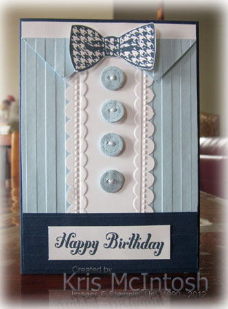 I started by cutting the collar shape onto a 10cm x 14.3cm piece of Bashful Blue card. Once I had done my cutting, I embossed the card using the Stripes Embossing Folder. Next I took a strip of Whisper White card and punched both long edges with the Scallop Border Punch. I also embossed using one of the Needlepoint Border Embossing Folders. I attached this strip to the embossed Bashful Blue card and added a dimension under each “collar” piece to hold it in place. This piece was then attached to Whisper White card and then to scored and folded Night of Navy card. I embossed a piece of Night of Navy card with the Stripes Embossing Folder, so that the stripes run across the card when attached over the bottom of the Bashful Blue card. I stamped the tie from the Dapper Dad stamp set onto Whisper White card using Night of Navy ink and cut it out. I attached it to the card front using a Glue Dot in the middle and a dimensional under each side. I cut four buttons using the Buttons #5 Sizzlit from Bashful Blue card. I pushed out the buttonholes and attached three 1/2″ Circles of the same colour to the back of each button to give it some dimension. I pushed the buttonholes through the stacked card and then added a little Whisper White Bakers Twine which I held in place using a Glue Dot. I attached the buttons to the card front using Glue Dots. Lastly I stamped “happy birthday” from the Bring on the Cake Stamp set onto Whisper White card and attached it to the card front.