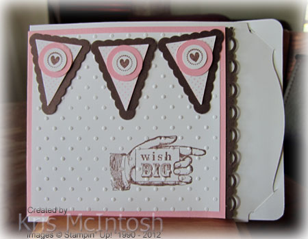 I stamped “wish big” from the Bring on the Cake stamp set onto the bottom right hand corner of Whisper White card, embossed it using the Perfect Polka Dot Embosing Folder before attaching it to the card front. I stamped the “dotted” image from the Pennant Parade stamp set onto Whisper White card using Pretty in Pink ink. I used the Pennant Builder Punch to cut them out and attached them to Chocolate Chip card cut with the same punch. I stamped the hearts from the Itty Bitty Bits stamp set onto Whisper White card using Chocolate Chip ink, punched them out using the 1/2″ Circle Punch and added them to Chocolate Chip 3/4″ Circles. I attached all these pieces together and attached them to the card front.