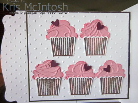 I punched the little hearts from Rich Razzleberry card using the Owl Builder Punch. The embossed Whisper White card is attached to Chocolate Chip card and then the dress form piece. I cut another piece of Whisper White using the Pop ‘n Cut Base and embossed it using the Perfect Polka Dots Embossing Folder. I trimmed the piece so that it fitted behind the cupcakes and covered the “hole” where the dress form pops up. I cut another piece of Whisper White and embossed it again using the Perfect Polka Dots Embossing Folder, attached it to Pretty in Pink card which has both long edges punched using the Scallop Trim Border Punch and then to the card base.
