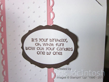 To cover the holes where the die pops up, I cut a piece of Pretty in Pink card which is only 6″ x 4″ and scored on the 6″ length at 1-3/4″. I punched one long edge of a strip of Chocolate Chip card using the Scallop Trim Border Punch, attached it behind the edge of the Pretty in Pink card and then attached the base inside.