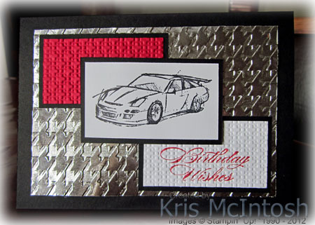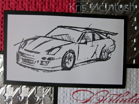I embossed the greeting piece using the Square Lattice Embossing Folder, attached it to Basic Black card and then to the card front. I stamped the “racing car” image from the Need For Speed stamp set onto Whisper White card using Stazon Jet Black ink. I attached the image panel to Basic Black card and then to the card front using dimensionals.