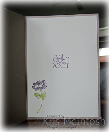 For the inside of the card, I inked the flower image using the same Stampin’ Write Markers and stamped onto the lower left hand side of Very Vanilla card.  I stamped “Get Well Soon” from the Delightful Dozen stamp set using Perfect Plum ink and making sure that you can’t see it when the card is closed.