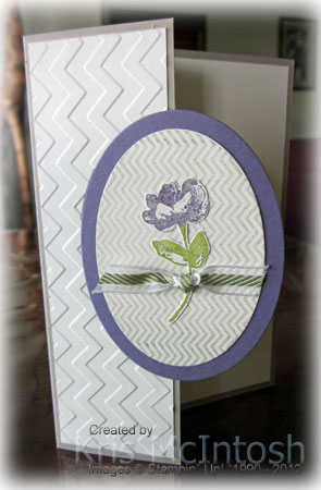 074I started with a standard sized Crumb Cake card and  cut the front panel down to 5cm (about 2″).  I embossed a piece of Very Vanilla card using the Chevron Embossing Folder and added it to the front panel.  I stamped the background image from the Oh Hello stamp set onto Very Vanilla card using Crumb Cake ink and cut it out using the matching Ovals Collection Framelit.  I cut one size larger oval from Perfect Plum card and attached the stamped oval to the centre.  I added adhesive on the left hand side of the back of the image panel and attached it over the embossed Very Vanilla card.  I inked the flower image from the Oh Hello stamp set using Perfect Plum and Old Olive Stampin’ Write Markers, stamped onto Very Vanilla card and cut it out.  I attached the flower image to the centre of the oval.  I tied a knot in a piece of Old Olive Striped Organdy Ribbon and attached it over the flower stem using a Glue Dot.0237