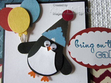 I created the balloons by punching Marina Mist, Cajun Craze and Daffodil Delight card using both the Small Oval Punch and the heart from the Owl Builder Punch. The penguin and the balloons are attached to Whisper White card using glue dots and dimensionals with a little Linen Thread to make the balloon “strings”. The image panel is attached to Basic Black card and then the card front using dimensionals. I stamped “bring on the cake” from the Bring on the Cake stamp set using Midnight Muse ink onto Whisper White card and punched it out using the Scallop Oval Punch. I attached it to a Cajun Craze Wide Oval and then the card front using a dimensional.