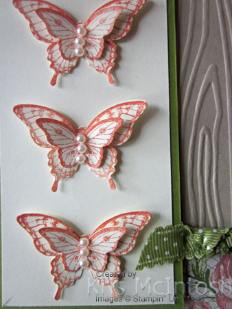 0143I embossed a piece of Crumb Cake card using the Woodgrain Embossing Folder and attached a piece of the beautiful Tea for Two Designer Series Paper to the lower edge.  Old Olive 1/2″ Dotted Scalloped Ribbon covers the join and then the whole piece was attached to scored and folded Crumb Cake card.  I stamped the butterflies, three large and three small from the Papillon Potpourri stamp set onto Very Vanilla card using Calypso Coral ink.  The large butterflies are punched using the Elegant Butterfly Punch and the small butterflies are punched using the Bitty Butterfly punch. The butterflies are attached to each other using Glue Dots in the centre of the body and small pieces of dimensional under the wings and then to the Very Vanilla card, again using Glue Dots and  1/2 a dimensional under each wings.  0153Three of the “string of pearls” on the Basic Pearls sheet are added to the centre of the small butterfly.  I like to add the dimensionals under the wings so that the butterflies will keep some dimension even after they are sent through the post.  The image panel is attached to the card front using dimensionals and another piece of Old Olive 1/2″ Dotted Scallop Ribbon is tied to the attached ribbon to the right of the image panel.  I stamped happy birthday from the Easy Events stampset using Calypso Coral ink on Very Vanilla card and punched it using the Word Window punch.  The greeting is attached to an Old Olive Modern Label and then the card front.  I stamped three of the large butterflies onto the left hand side of Very Vanilla card using Calypso Coral ink and attached it to the inside of the card.