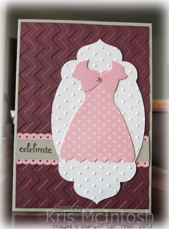 I attached this panel to the card front using dimensionals. I cut the sleeveless dress from Pretty in Pink Polka Dot Designer Series paper from the Brights Designer Series Paper Stack using the Dress Up Framelits. I also cut one dress with sleeves from Pretty in Pink card. The Pretty in Pink dress is punched with the Full Heart Punch to create a cute little “shrug”. I attached the “shrug” to the dress, added a Basic Rhinestone for bling and attached it to the embossed Whisper White framelit.