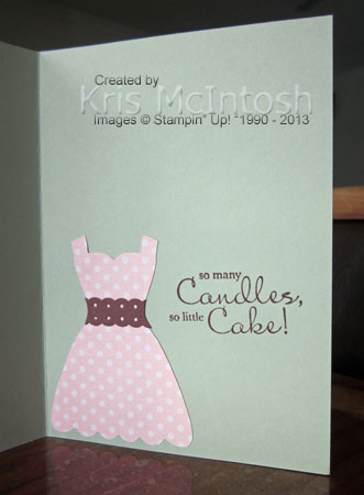 Inside the card I added a sleeveless dress cut from the Pretty in Pink Polka Dot Designer Series Paper. I punched a strip of Bravo Burgundy card using the Dotted Scallop Border Punch and added it to the waist of the dress. I stamped the greeting from the Bring on the Cake stamp set using Bravo Burgundy ink.
