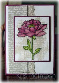 I attached a length of Sahara Sand 7/8″ lace trim behind a piece of Sahara Sand designer series paper from the Neutrals Colour Collection before attaching it to Whisper White card. I stamped the background stamp from the You’ve Got This stamp set onto Whisper White card using Sahara Sand ink. The stamped card is attached to Rich Razzleberry card and then the card front using dimensionals.