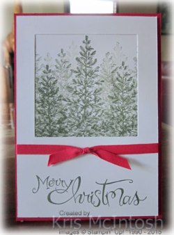 Already!  It’s coming sooner than you think!  We are going to be making one Christmas card each week from now till the end of the year.  I was inspired by one of the samples in the new Holiday Catalogue to create this card (Catalogue starts on the 1st September so contact me or your demonstrator to get your copy).  I hadn’t received my pre-order so I used what I had.  I cut a square in Whisper White card using one of the Squares Collection Framlits Dies and stamped the greeting from the Sassy Salutations stampset onto the bottom of the Whisper White card using Mossy Meadow ink.  I wrapped the card with Real Red 1/4″ Cotton Ribbon and tied a knot.  0185 I stamped a square of Whisper White card with the single tree from the Lovely As A Tree stamp set using Mossy Meadow ink (I made sure that the card was slightly larger than the cut out window).  I stamped the image multiple times without re-inking. I wanted to create a feeling of depth, so just kept adding images until it had the look of a “forest”.  I attached the trees behind the square cut in the card front.  The card front panel is attached to scored and folded Real Red card using dimensionals.  I stamped the same tree onto the lower left hand corner of Whisper White card three times without re-inking and attached to the inside of the card.