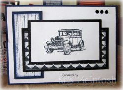I stamped the triangle image from the Dotty Angles stamp set onto Whisper White card using Memento Tuxedo Black ink, sponged the edges with the same ink and attached it to Basic Black card. The panel is attached to the Whisper White card over the Night of Navy panel. I stamped the car from the Guy Greetings stamp set onto Whisper White card using the Memento Tuxedo Black ink and attached it to Basic Black card. The image panel is attached to the card front using dimensionals. Lastly I added three Basic Black Candy Dots from the Neutrals Candy Dots collection to the upper right hand corner. Simple.