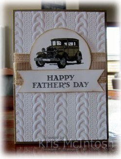 The embossed Whisper White card is attached to scored and folded Soft Suede card. I stamped the car image from Guy Greetings onto Whisper White card using Memento Tuxedo Black ink and coloured it using Soft Suede, Smoky Slate and Basic Black Stampin’ Write Markers. The image is cut using one of the Layering Circle Framelit Dies and sponged the edges lightly with Soft Suede ink before attaching it to the card front using dimensionals. I stamped the greeting using Memento Tuxedo Black ink onto scrap Whisper White card and cut the ends using the Triple Banner Punch. The banner has also been lightly sponged around the edges and is attached with dimensionals so that it lies flat over the lower part of the stamped circle.