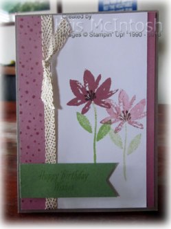 To launch the catalogue I decided to CASE the Sale-A-Bration catalogue and re-create one of the cards on Page 4.  I started by stamping the large flower from the Avant Garden stamp set twice onto Whisper White card using Sweet Sugarplum ink without re-inking between stamps. 0032 I stamped the stems twice using Wild Wasabi ink, again without re-inking between stamps.  The leaves are added in the same manner.   Lastly I added the flower centre using Early Espresso ink and you guessed it – without re-inking.  I love the soft subdued look of the second image.  I stamped the dotted background stamp down the left hand side of Sweet Sugarplum card using Sweet Sugarplum ink and then attached the stamped Whisper White panel.  I wrapped the left hand side of the Whisper White card using the Gold Metallic Ribbon which is also one of the things you can earn free from the Sale-A-Bration catalogue and tied a knot. 0042 The Sweet Sugarplum card is attached to scored and folded Tip Top Taupe card.  I stamped the “happy birthday wishes” which is also part of the Avant Garden stamp set onto Wild Wasabi card using Wild Wasabi ink.  The right hand edge is punched using the Triple Banner Punch before attaching it to the card front.