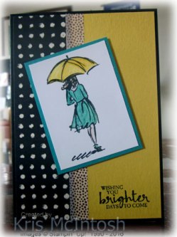 I stamped the lady with the umbrella image from the Beautiful You stamp set onto Whisper White card using Memento Tuxedo Black ink. The image is coloured using Bermuda Bay, Daffodil Delight, Calypso Coral and Early Espresso Watercolour Pencils and a Blender Pen. I attached the stamped image to Bermuda Bay card and then the card front using dimensionals.