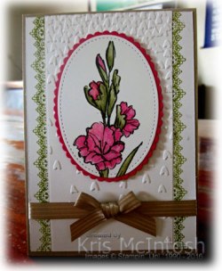 For this card I cut a piece of copy paper and attached it to Whisper White card. I stamped the lace image from the Delicate Details stamp set so that it just touched the edges of the copy paper using Old Olive ink. Once I removed the copy paper I had a lovely border and a place to attach the Whisper White card I embossed using the Falling Petals Embossing Folder.