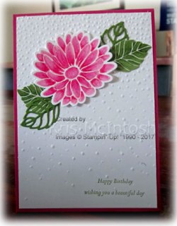 Have you seen all the gorgous creations being shared all over the net using the Special Reason stamp set. Let me say this wasn’t on my wish list and I didn’t purchase it until last week when I just had to give in and try and create something gorgeous. I was directed to a facebook Video by Alisa Tilsner (after you click the link you will need to select the video which is episode 11) which showed a technique using Watercolour Pencils on top of a stamped image and decided to give it a try. I followed the video and created my flowers and leaves using the same colours that Alisa did but used one of those sketches in that book I have sitting on my desk to create my card.