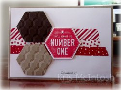 To create my card I started by adding Candy Cane Lane Designer Washi Tape (retired) across the centre of Whisper White card and attached it to scored and folded Crumb Cake card. I cut Early Espresso and Crumb card using the hexagon die from the Build It Framelits Dies and embossed each one using the Hexagon Embossing Folder. I stamped the greeting from the Urban District stamp set onto Whisper White card using Real Red ink and cut it out using the same hexagon Framelit Die.