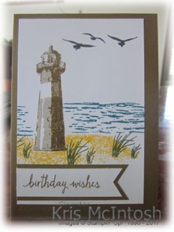 I stamped the first image for the lighthouse from the High Tide stamp set onto Whisper White card using Sahara Sand ink and stamped the second image over the top using Soft Suede ink. I stamped the sand image using Crushed Curry ink and added the water image using Island Indigo ink.
