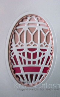 I started by cutting an oval from the left hand side of Whisper White card using the Layering Ovals Framelits Dies and stamping the greeting from the Suite Sayings stamp set onto the right hand side using various inks – Blushing Bride, Melon Mambo, Rose Red, Cherry Cobbler, Marina Mist and Pacific Point. ( I realise that by having the card with the lightest ink at the front you can hardly read the greeting. It says – Wishing you all the beautiful blessings of Easter – kind of nice isn’t it?). To create the “Easter Egg”, I cut a frame from one of the pink or blue colours using the Layering Ovals Framelits Dies to match the stamping and attached it behind the oval cut out. I used the Up and Away Thinlits Dies to cut the various shades of pink or blue, including additionally Pink Pirouette, Soft Sky, Pacific Point, Dapper Denim and Night of Navy. I also cut six Whisper White detailed balloons using the same set of dies. I attached the pieces of pink or blue card behind the balloon and then attached the balloon behind the oval. I trimmed away whatever part of the balloon I didn’t need and attached the Whisper White card to the scored and folded card bases using dimensionals.