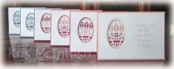I started by cutting an oval from the left hand side of Whisper White card using the Layering Ovals Framelits Dies and stamping the greeting from the Suite Sayings stamp set onto the right hand side using various inks – Blushing Bride, Melon Mambo, Rose Red, Cherry Cobbler, Marina Mist and Pacific Point. ( I realise that by having the card with the lightest ink at the front you can hardly read the greeting. It says – Wishing you all the beautiful blessings of Easter – kind of nice isn’t it?). To create the “Easter Egg”, I cut a frame from one of the pink or blue colours using the Layering Ovals Framelits Dies to match the stamping and attached it behind the oval cut out. I used the Up and Away Thinlits Dies to cut the various shades of pink or blue, including additionally Pink Pirouette, Soft Sky, Pacific Point, Dapper Denim and Night of Navy. I also cut six Whisper White detailed balloons using the same set of dies. I attached the pieces of pink or blue card behind the balloon and then attached the balloon behind the oval. I trimmed away whatever part of the balloon I didn’t need and attached the Whisper White card to the scored and folded card bases using dimensionals.