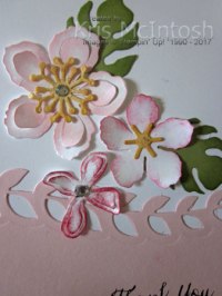 I cut the top of a piece of Pink Pirouette card using the border from the Botanical Builder Framelit Dies (unfortunately these dies are retiring) and attached it to Whisper White card.  I stamped the greeting from the Rose Wonder stamp set onto the Pink Pirouette card using Memento Tuxedo Black ink.  The stamped panel is attached to scored and folded Pear Pizzazz card.  I cut the flowers from Whisper White card using the Botanical Builder Framelit Dies.  I sponged the edges of the large split flower using Pink Pirouette ink, the large solid flower using Rose Red ink and the small split flower using Cherry Cobbler ink.  I used my bone folder to add some shape to the flower petals and attached them to the card front using Glue Dots.  I cut the two flower centres from So Saffron card and sponged the edges using the same ink.  The flower centres are attached to the large split flower and the large solid flower using Glue DotsI cut the leaves from Pear Pizzazz card and sponged the edges with the same ink before attaching to the card front behind the flowers.  I added large Basic Rhinestones to the centres of each of the flowers.