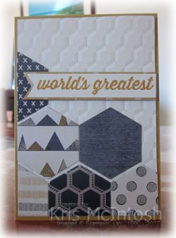I stamped “world’s greatest” from the Urban District stamp set onto Very Vanilla card using Delightful Dijon ink and cut one end using the Triple Banner Punch. I punched one end of a strip of Urban Underground Designer Series Paper and attached it behind the greeting. The greeting banner is attached to the card front using dimensionals.