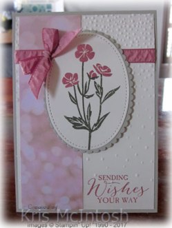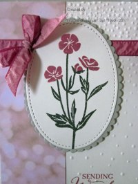 This is a card that once more uses retiring product –  Falling in Love Designer Series paper.  Such pretty paper and I still have heaps left, so now is the time to use it up before all the new goodies arrive. I stamped the greeting from the Butterfly Basics stamp set onto the lower right hand corner of Whisper White card using Sweet Sugarplum ink and embossed the stamped card using the Softly Falling Embossing Folder (I am so glad that this embossing folder is carrying over to the new catalogue.)I attached a strip of the Falling in Love Designer Series Paper to the left hand side of the embossed card.  I wrapped the card with some of the Sweet Sugarplum Ruched Ribbon before attaching to scored and folded Sahara Sand card.  I stamped the flower stem from the Wild About Flowers stamp set onto Whisper White card using Always Artichoke ink.  I stamped the flower image onto the flower stem using Sweet Sugarplum ink.  I cut the flower image using one of the ovals from the Stitched Shapes Framelits Dies and attached it to a scalloped oval cut using the Layering Ovals Framelits Dies The image panel is attached to the card front using dimensionals.