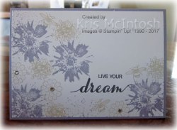 This card was inspired by one that I found on Pinterest by Cynthia Van Der Wilk. I changed the main colour and the orientation but just loved her card. I stamped the greeting which comes from the Dare to Dream stamp set onto Whisper White card using Memento Tuxedo Black ink. The flower image from the Touches of Texture stamp set is stamped onto the Whisper White card using Wisteria Wonder ink.