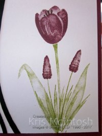 I love how the stamped images have such variation of colour without having to do anything except ink and stamp. I stamped the large tulip using Rich Razzleberry ink. This is a two step process and again you do not have to stamp off first to give the gorgeous colour depth. The smaller flower is also stamped in Rich Razzleberry and is also a two step process without the need to stamp off for the first layer. I then used about five different images to add the leaves to the base of the flowers. There are two large and at least three small images that you can stamp to give the effect of lots of foliage around the flowers. The stamped panel is attached to scored and folded Rich Razzleberry ink.