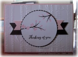 This is another of the cards for my July Card Class. This one was inspired by a sketch challenge – I have forgotten which one, but thank you whoever you are. I embossed Whisper White card using the Woodlands Embossing Folder and attached it to scored and folded Pink Pirouette card. I punched both ends of a narrow strip of Early Espresso card using the Triple Banner Punch and attached it to the card front using dimensionals.