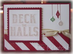 I wrapped the top of the paper with a length of Gold 3/8″ Metallic Edge Ribbon and tied a knot. I stamped one of the ornament images from the Carols of Christmas stamp set onto the right hand side of the Whisper White card using Cherry Cobbler ink. On scrap paper I stamped the same image three times, once using Cherry Cobbler ink, once using Garden Green ink and once using Crumb Cake ink. I used the co-ordinating Card Front Builder Thinlits Dies to cut out all of the ornaments. Then I attached one of each colour over the stamped images using Tombow Multipurpose Glue. The panel is attached to scored and folded Cherry Cobbler card. I stamped the greeting from the Carols of Christmas stamp set onto Whisper White card using Crumb Cake ink and cut it out using one of the Layering Squares Framelits Dies. I attached the greeting to a Cherry Cobbler scalloped square cut using the same dies and then the card front using dimensionals.