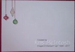 To decorate the inside I stamped the same ornament image from the Carols of Christmas stamp set onto the top left hand corner using Cherry Cobbler ink. I attached three of the ornaments that I had previously cut over the stamped image.